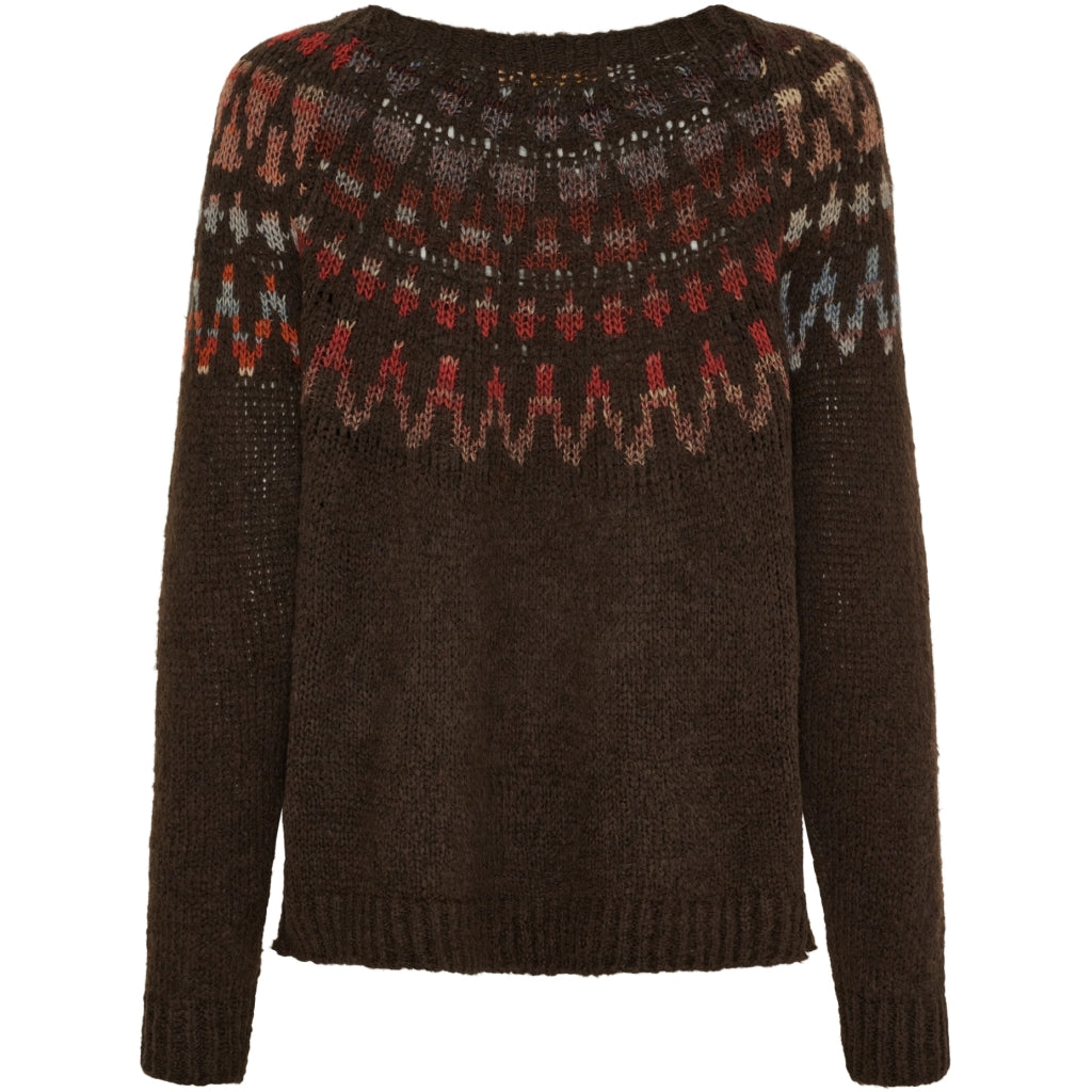 Flot grov strikket bluse fra Marta du cháteau. Camellia knit har rund hals, lange ærmer og en almindelig pasform. Strikken har et "islandsk strik" inspireret look i smukke farver; Chokolade brun med røde, orange, beige og blålige nuancer i printet