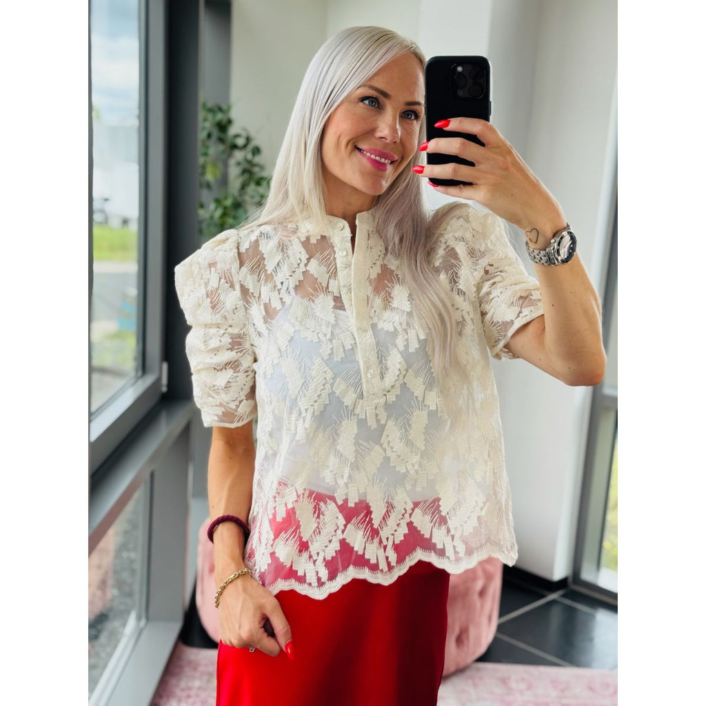 Se nu lige en smuk smuk bluse fra  Gossia.  Den er syet op i noget siffon stof hvorpå der er syet mønster med tråd. Den er gennemsigtig, så medmindre man er modig kræver den en top under. Der er kina krave og stolpe lukning afsluttet med en smuk bølgekant fornede. Ærmerne ligesom trukket sammen, så det giver et flot pufærme - den er virkelig smuk