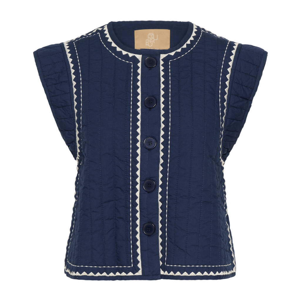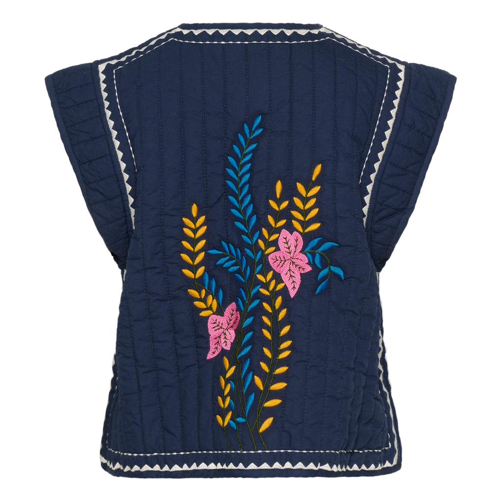 Virkelig flot vest fra Culture med et smukt blomsterprint på ryggen samt broderet kantbånd i hvid hele vejen rundt - også ved knaplukning. Vesten er en quilted bomulds kvalitet. Brug den til hverdag med en t-shirt/langærmet bluse under samt til et par jeans. Man kan også lege lidt med farverne i blomsterprintet på ryggen og sætte en bluse under i samme farvenuance.