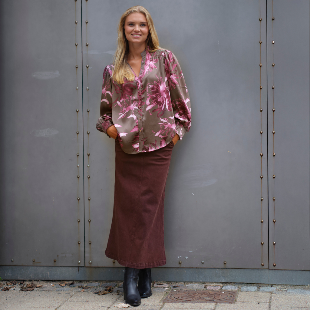Charlotte blouse er en meget smuk skjorte bluse i flot print fra Prepair.  Skjorten har lange ærmer der afsluttes med elastik/smock ved håndleddet. Den er gennemknappet med guld knapper og har en lille kina krave. Mønstret er vildt flot i rosa- gråbrune farver.