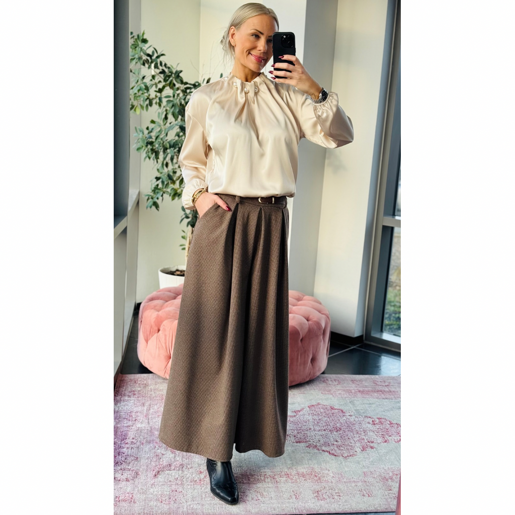 Super blød buksenederdel fra By Asbæk i tern i brunlige nuancer. Ella pants har elastiklinning, fine læg foran og lommer i siden. Der er ingen lommer bagpå. Ella pants har bæltestropper og et smalt brunt tilhørende bælte med guld spænde. De har meget vidde i benene. Buksen er en 7/8 benlængde.