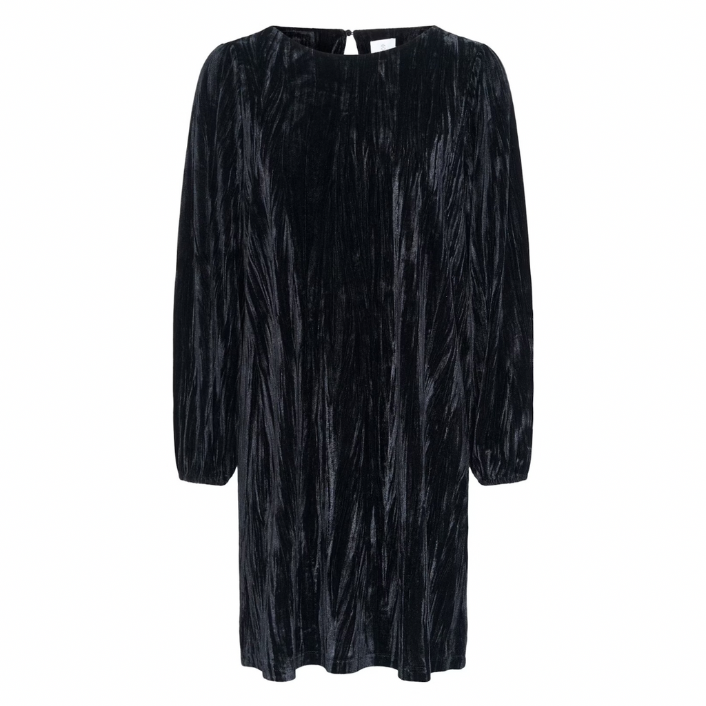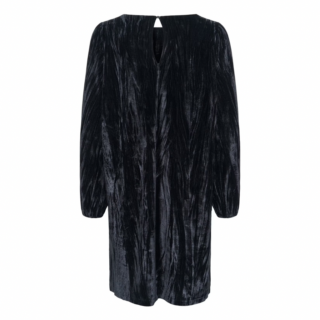 Super blød sort kjole fra Kaffe i en lækker velour kvalitet og i en let løs pasform. Elva dress har rund hals, lange ærmer som afsluttes med en elastik, som gør det muligt at trække ærmerne lidt op, hvis man ønsker det samt længde til lige under knæet.