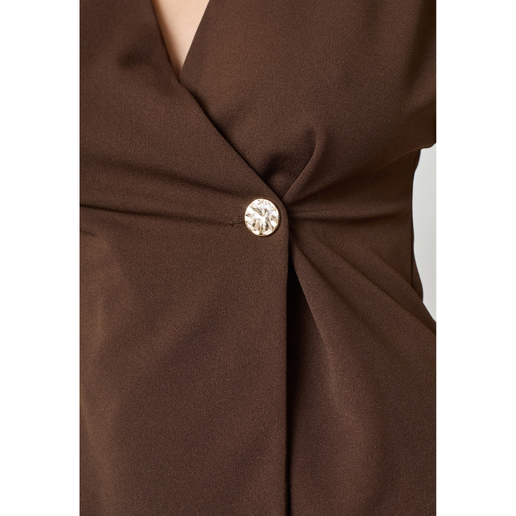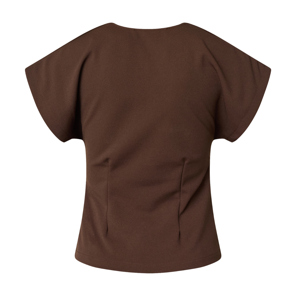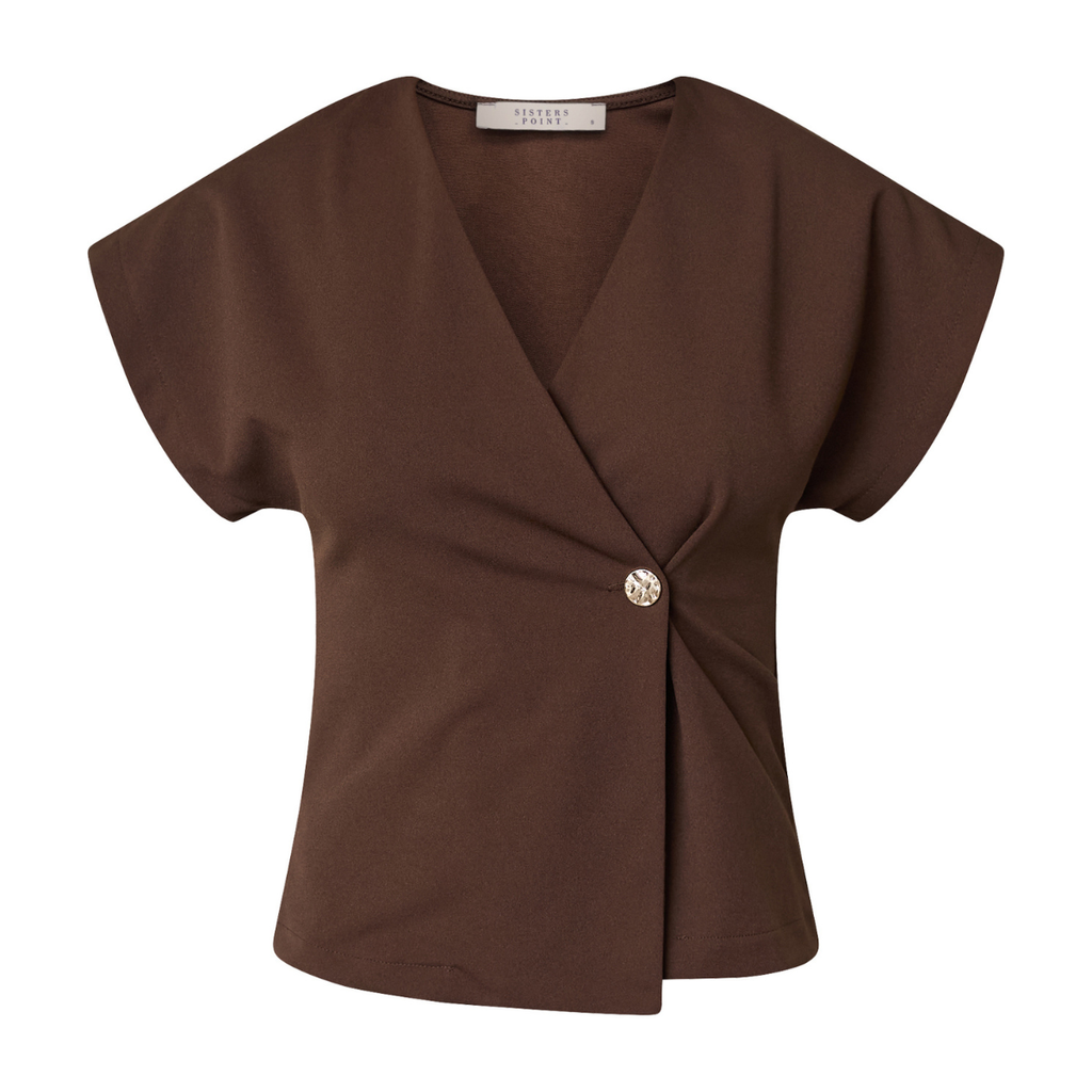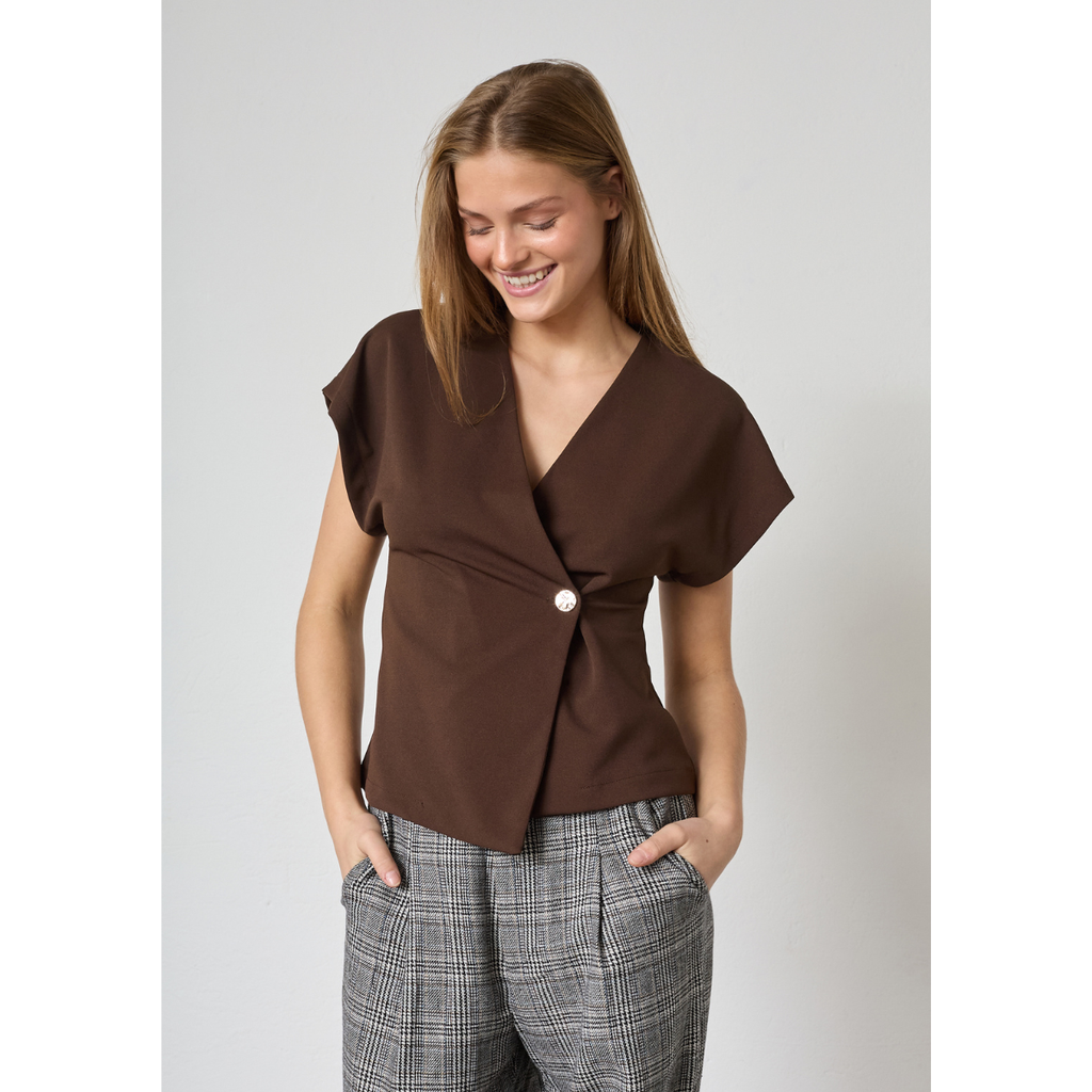GEVELA-VE er en kortærmet top med dyb v-udskæring og en asymmetrisk lukning i siden med en enkelt guldknap. Toppen har let markerede skuldre og en figursyet silhuet.