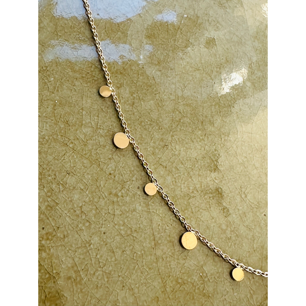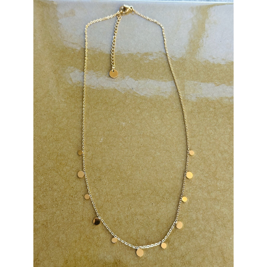 Virkelig sød halskæde med 11 små runde vedhæng fra By Asbæk, guldbelagt. Vedhængende har en diameter på 5 og 3 mm. Halskæden er ca. 40 cm lang, og har en forlænger på ca. 5 cm.