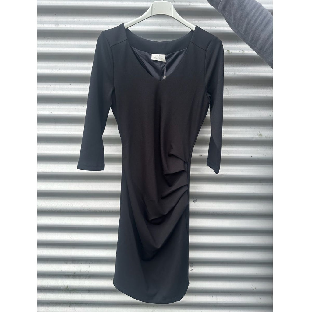 Super flot og meget velsiddende kjole med 3/4 ærme - v-hals og drapering over maven