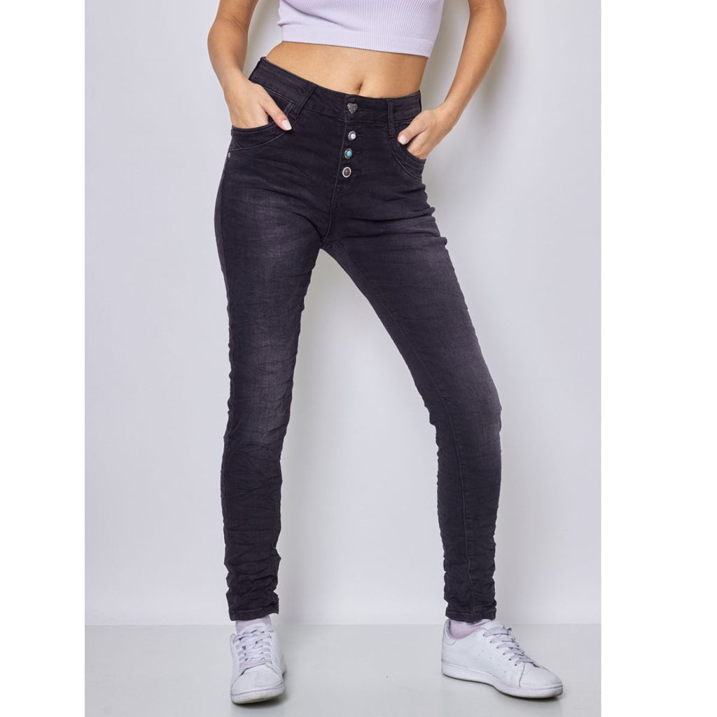 Lækre elastiske jeans fra By Asbæk  Ivy jeans er en klassisk 5-lomme model og lukkes med fire synlige knapper og de har en normal talje højde. De har masser af stræk og et krøllet look i buksebenene, som aftager ved brug.