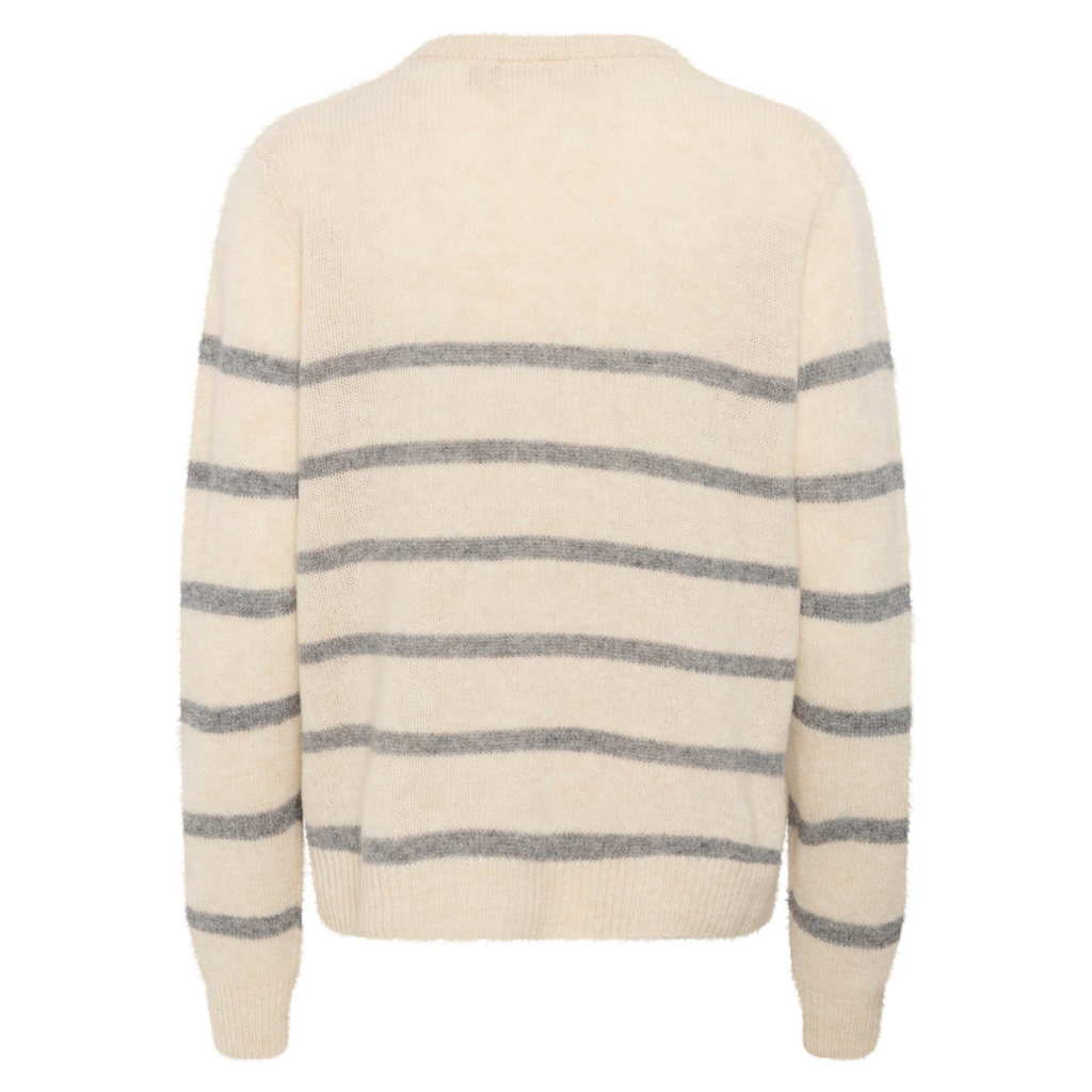 Lækker strik cardigan fra Culture i 100% uld og en dejlig let kvalitet. Strikken er i en flot beige meleret farve og med grå/blå striber, har rund hals, lange ærmer og er gennemknappet med lyse perlemorsknapper. Kan bruges lukket eller åbentstående. Super flot med en mesh eller blondebluse under.