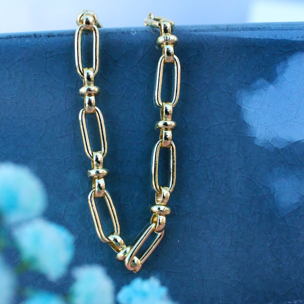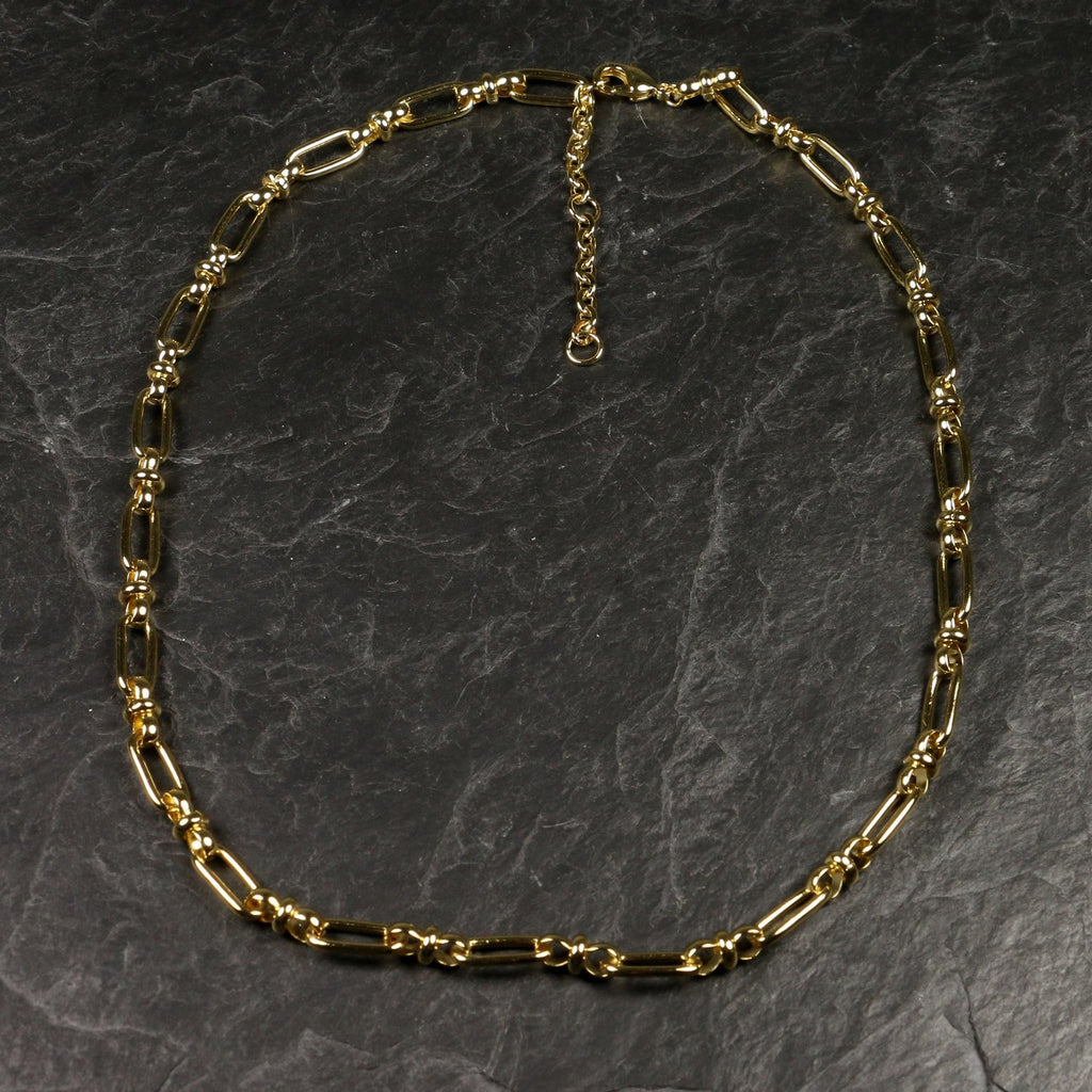Guldbelagt halskæde sammensat af lænker. Kæden måler 5 mm hvor den er breddest og er regulérbar fra 41-46 cm.