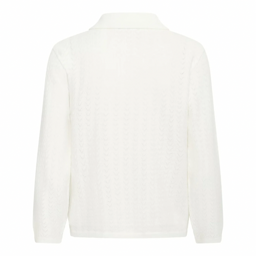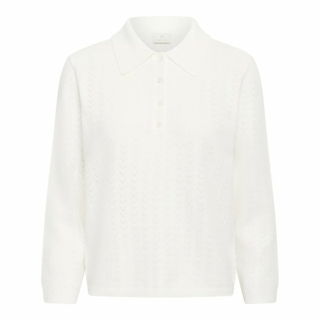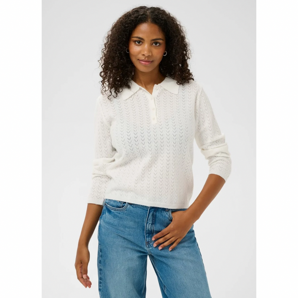 Smuk, feminin, hvid strik polo pullover fra Kaffe med lange ærmer. Strikken har polokrave og knapper ned til brystet. Den har det fineste hulmønster og en lækker blød og tynd kvalitet. Virkelig fin indenunder en blazer, hvis man ønsker et alternativ til en skjorte.