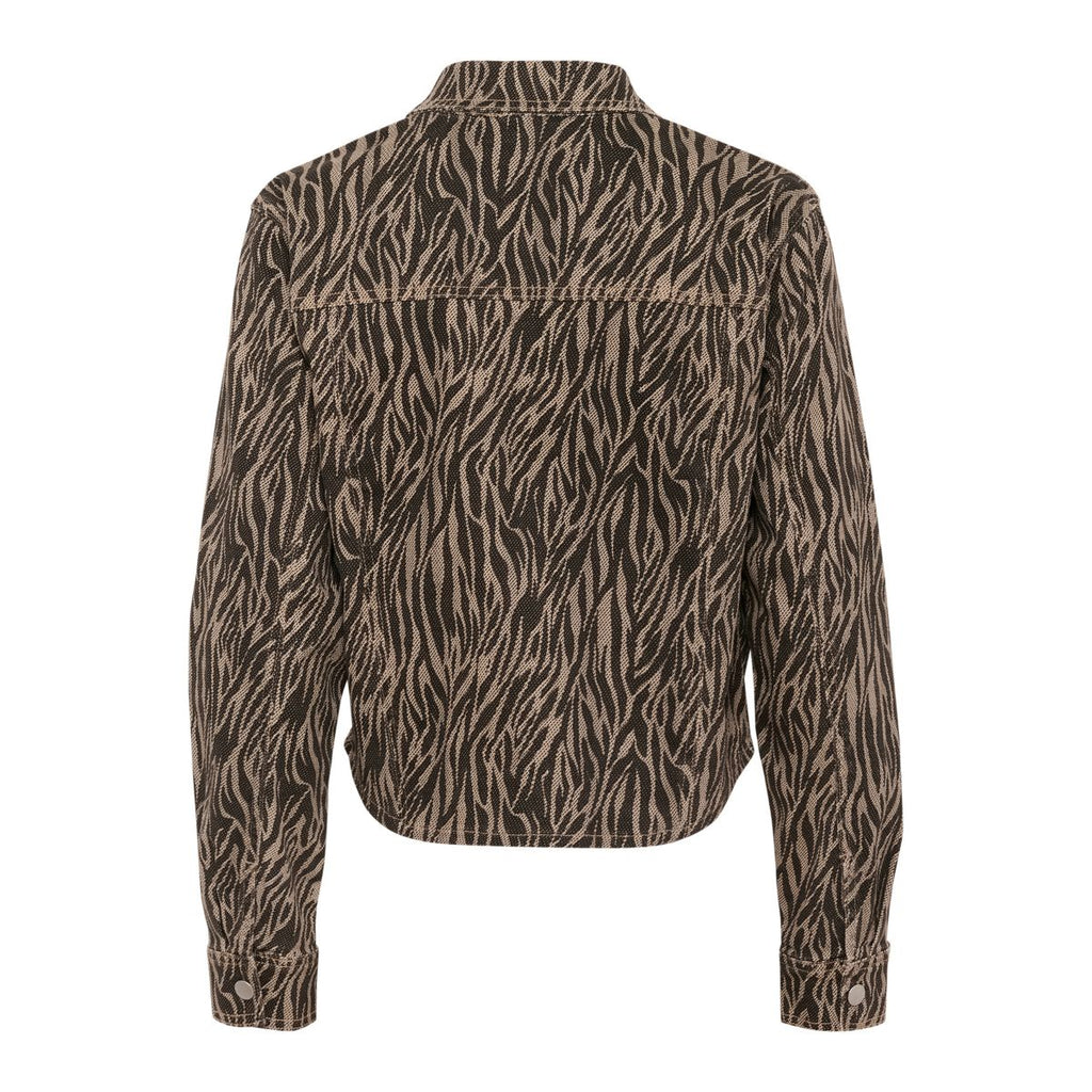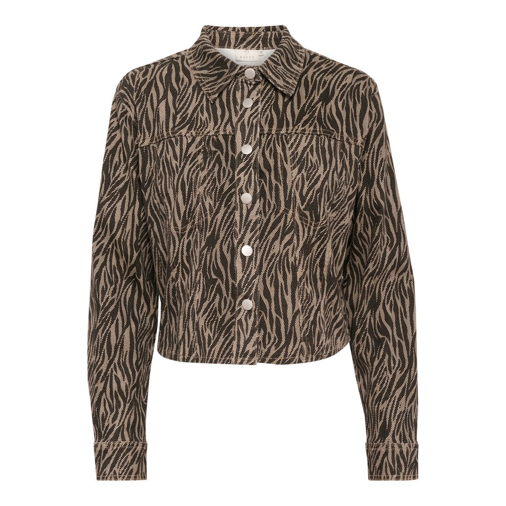 Cool cowboy skjorte/jakke i en zebra print i beige og sort fra Kaffe. Leondra har almindelig skjortekrave, 2 brystlommer og lange ærmer. Der er trykknapper hele vejen igennem  Den har en normal til slank pasform.