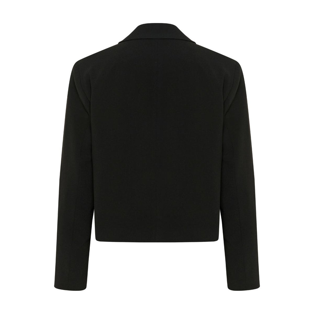 Kort sort blazer fra Kaffe. Lisa blazer er lavet i et lækkert blødt materiale, har almindelig revers, en enkelt knap og paspel lommer fortil. Den har snørrer detalje på ærmerne.