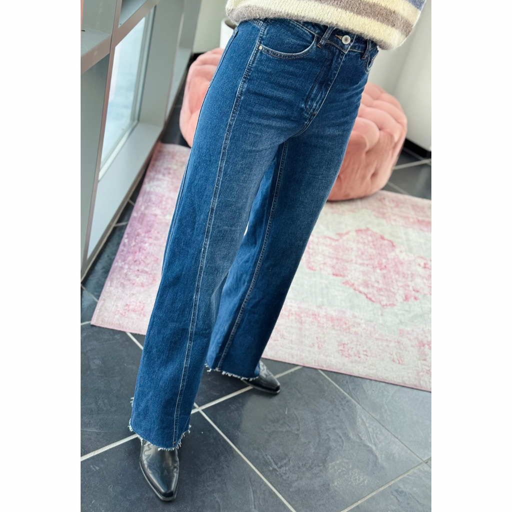 Super flotte vidde jeans fra By Asbæk  med stræk, høj talje og mellemlang benlængde.  Jeansene har en rå uafsluttet kant for neden på benene. Brug dem til hverdag med en lækker strik eller brug dem til en festligere lejlighed med en flot skjortebluse.