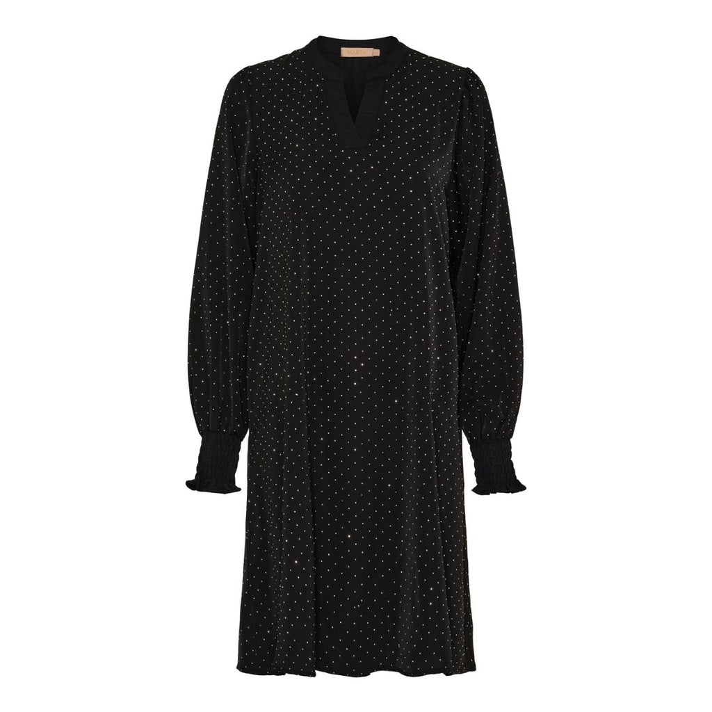 Rigtig fin kjole fra Marta du cháteau. Den har V-hals, lange ærmer med smock. Kjolen er sort med små fine similisten. Den har en løs og rummelig pasform. Kjolen er lidt længere bagpå.