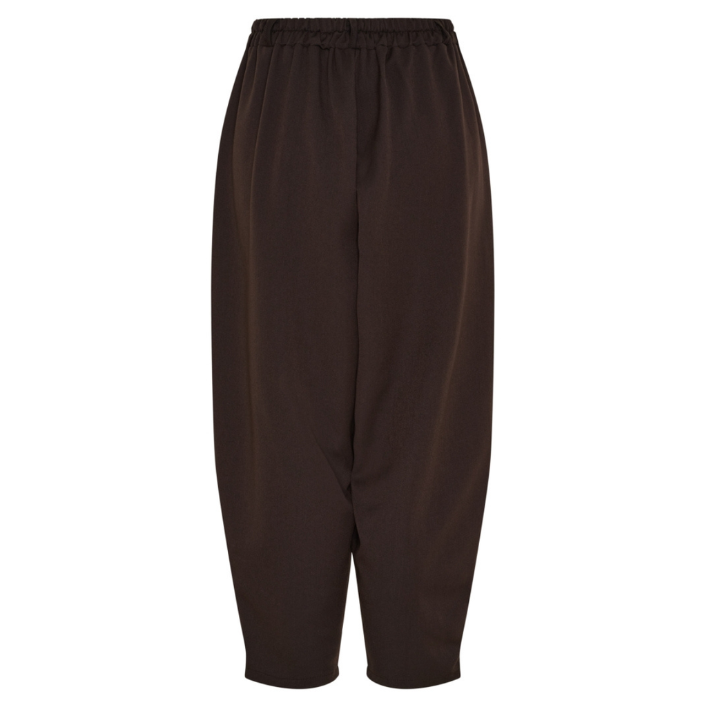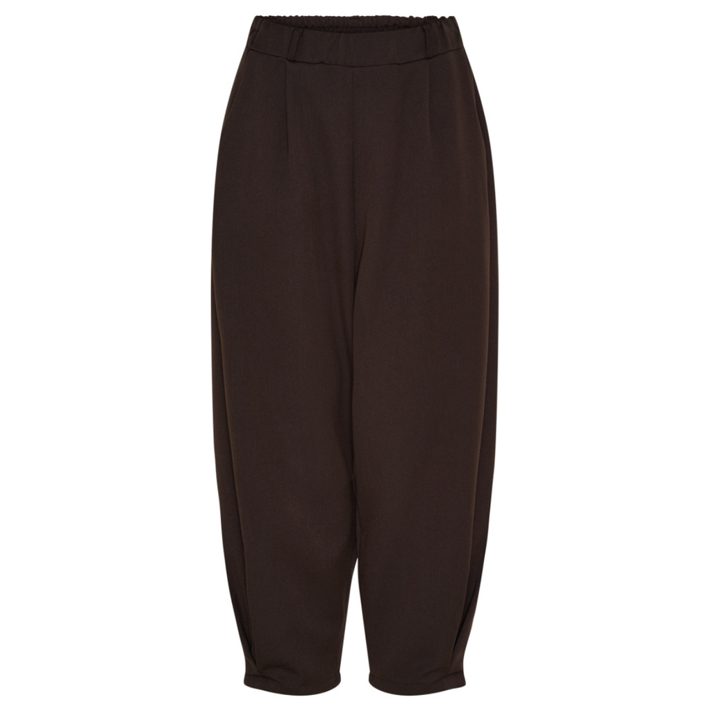 Cool bukser fra Marta du cháteau. i en lækker chokolade brun farve. Den har elastik i taljen er baggy nedom, 7/8 længde ben med indsnit så de går en smule ind forneden - sidelommer. Stoffet er som en habit buks men er mere afslappet i looket/modellen.