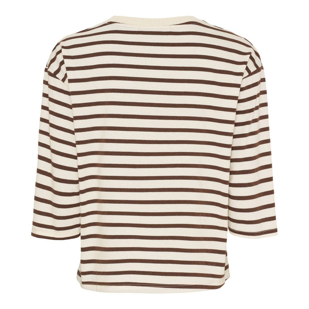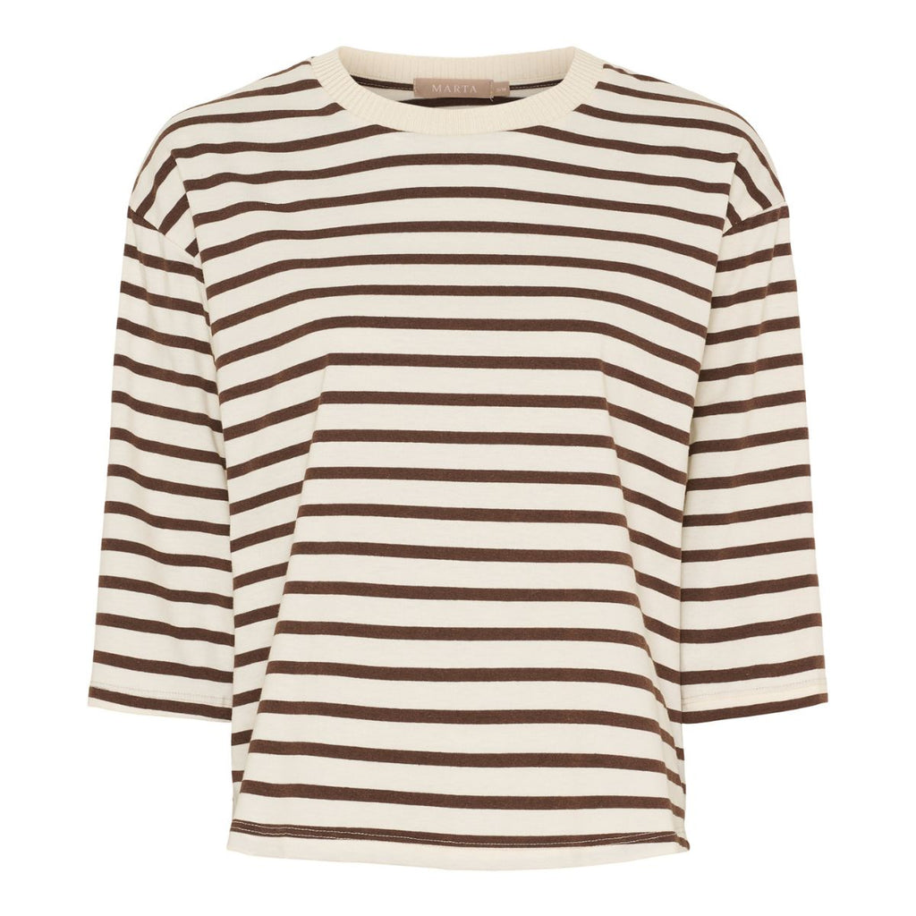 Skøn t-shirt fra Marta du cháteau. Den har rund hals, længden på ærmerne er midt på underarm og en rummelig pasform. Farven er råhvid med chokolade brune striber.