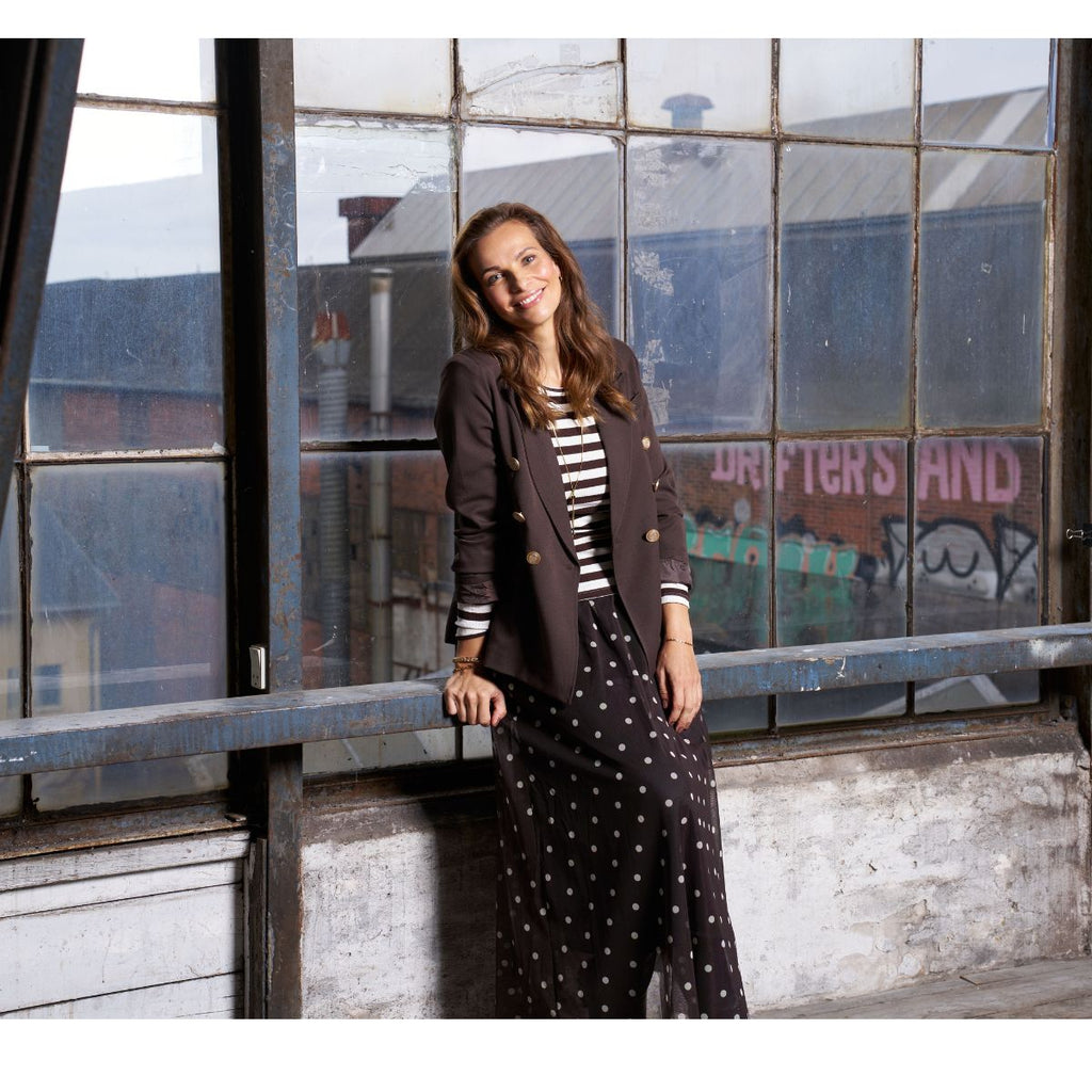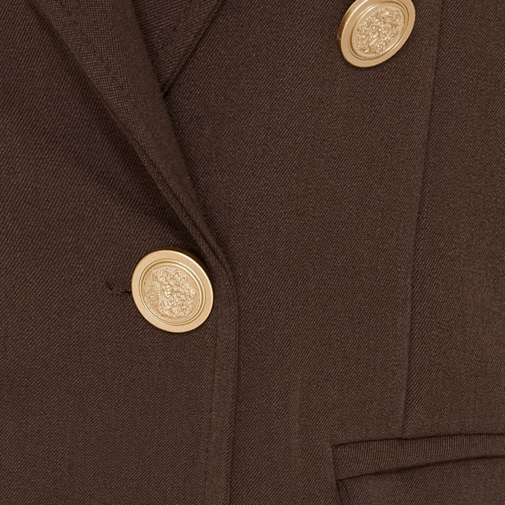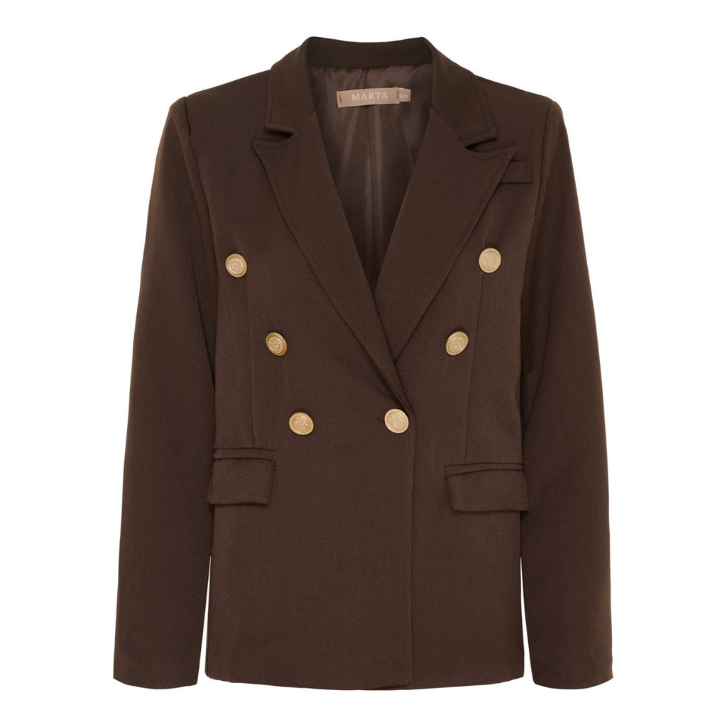 Den flotteste blazer i lækker chokoladebrun farve fra Marta du cháteau. Blazeren er flotte guldknapper foran ved revers. Den er ok rummelig størrelsen da den ikke er meget figursyet.Blazeren kan lukkes med 1 knap, eller bruges åben. Desuden har den paspel lommer foran og ved brystet.