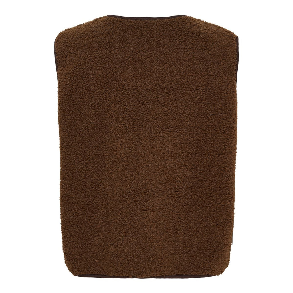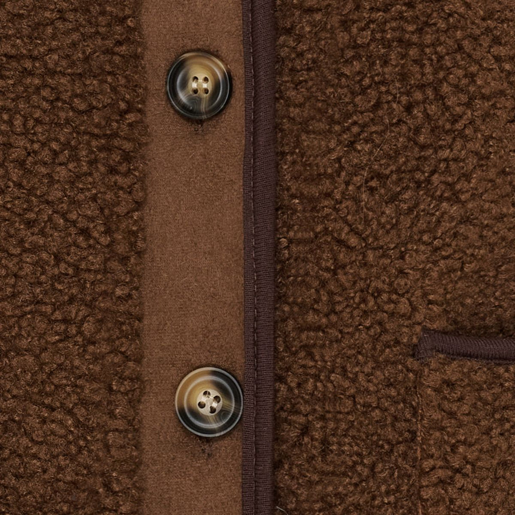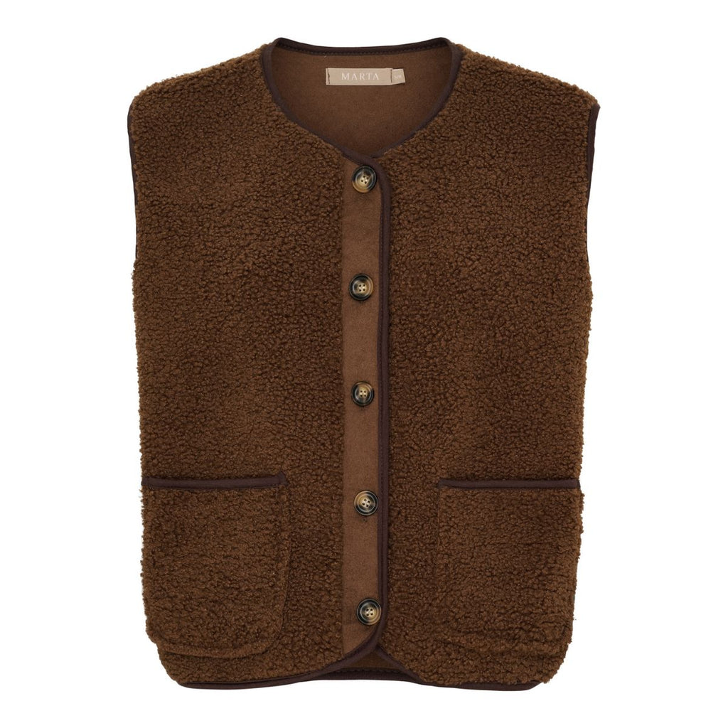 Virkelig lækker blød vest fra Marta du cháteau, i teddy kvalitet i en lækker mørkebrun farvel- den har fine opsatte lommer foran med kantebånd både på lommer, krave, ærmegab og kanter + et fint stykke foran med knapper. Brug den over kjoler, skjorter, t-shirts oven en lækker strik til en gåtur. Anvendelig til nærmest alt