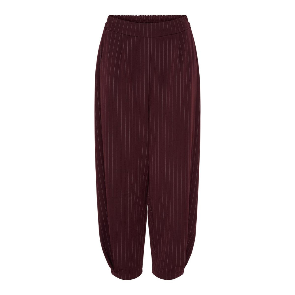 Cool bukser fra Marta du cháteau. i flot bordeaux med nålestrib. Den har elastik i taljen er baggy nedom, 7/8 længde ben med indsnit så de går en smule ind forneden - sidelommer. Stoffet er som en habit buks men er mere afslappet i looket/modellen. Der er balzer i samme ( Damiana Blazer) Et et par rigtig flotte efterårs bukser.