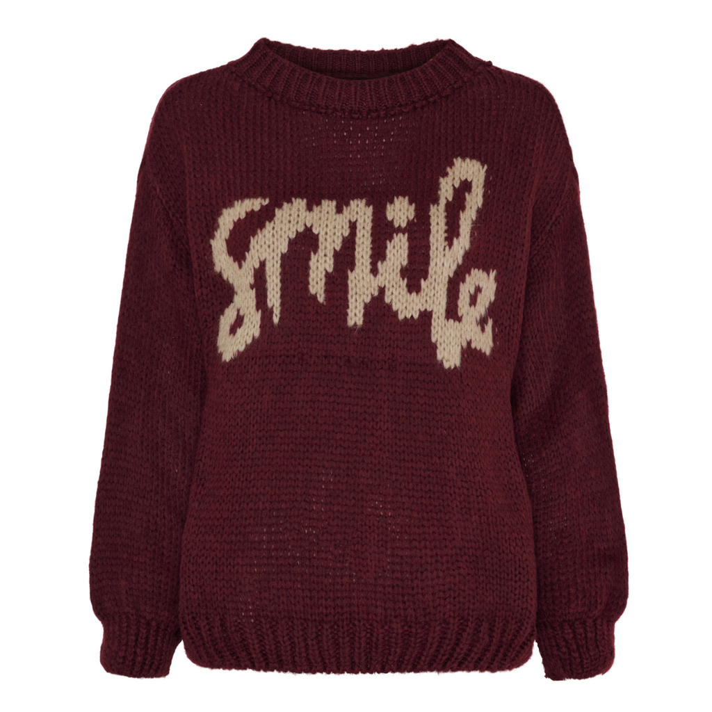 Super skøn blød strik fra Marta du cháteau i en flot bordeaux farve med en strikket tekst " Smile" i lyserød.  Strikken er lidt oversize men falder flot og er klædelig til rigtig mange stylinger. En skøn kvalitet der er blød og varm og uden krads effekt 😉 en rigtig vinter strik