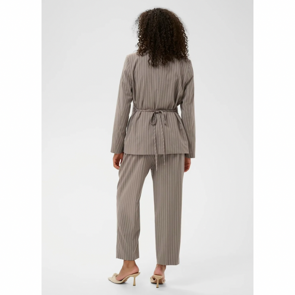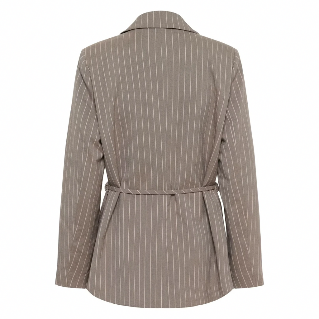 Meril Blazer er en stilfuld og moderne blazer fra Kaffe. Denne blazer er i farven Beige Pinstripe, som giver et elegant og tidløst udseende, der nemt kan styles med forskellige outfits. Meril Blazer har en klassisk pasform, der flatterer de fleste kropstyper, og den kan bæres over en bluse eller en kjole for et sofistikeret look. Blazeren lukkes med to knapper, og der er et fint bindebånd med i samme farve, man kan binde i taljen, hvis man ønsker mere shape.