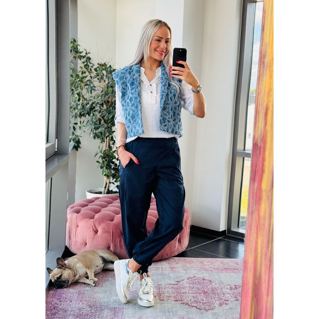 Flot og lækker denim vest fra Gossia. Som vanligt har Gossia ikke sparet på detaljerne og selvom veste "kun" er i denim - så stråler den af luksus. Der er laver flotte blomster rundt på vest, de er lavet af strimler af denim stof der flænser lidt, det ser mega cool ud. - Der er ikke noget lukke tøj og kraven går lidt op i nakken. Brug den til sommerkjolen - festen - bukser - nederdel !