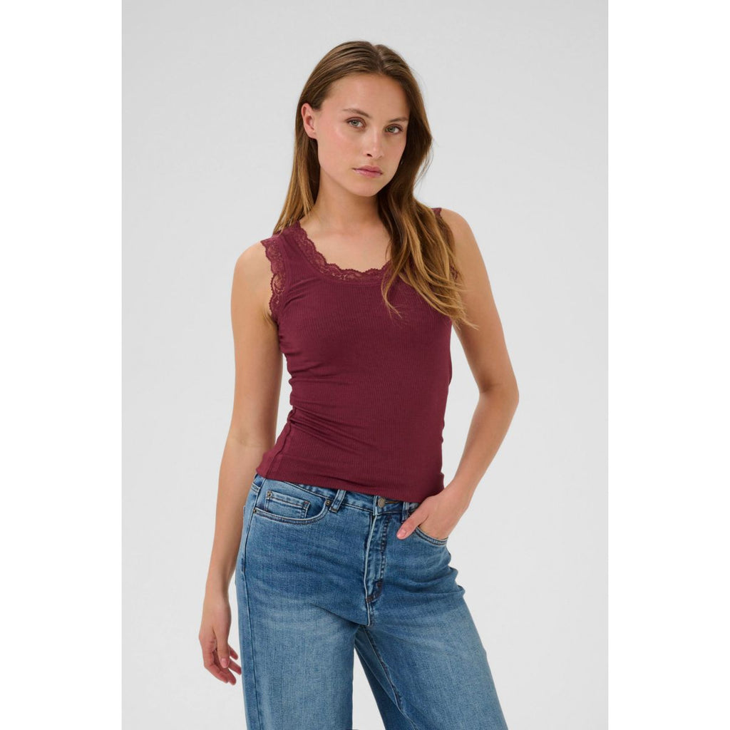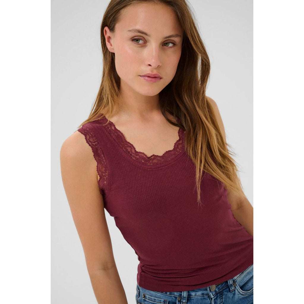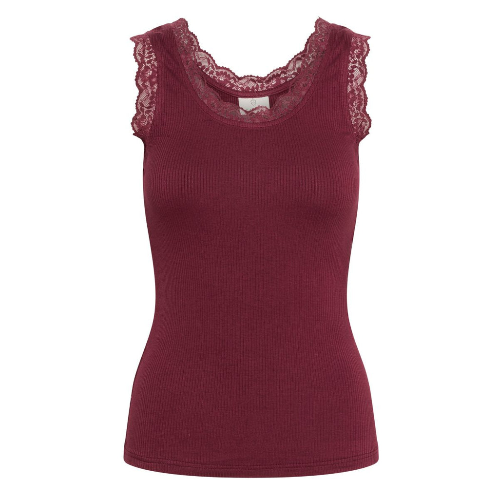 Klassisk top fra Kaffe, i en ribbet kvalitet i en flot vin rød farve. Den har rund udskæring og blonde langs hals og ærmegab - brug den alene eller under alt muligt