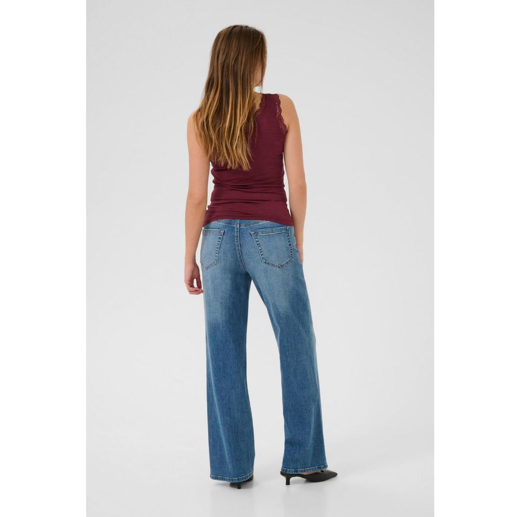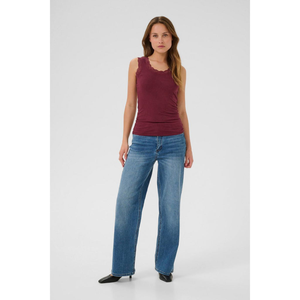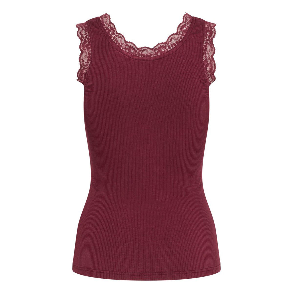 Klassisk top fra Kaffe, i en ribbet kvalitet i en flot vin rød farve. Den har rund udskæring og blonde langs hals og ærmegab - brug den alene eller under alt muligt