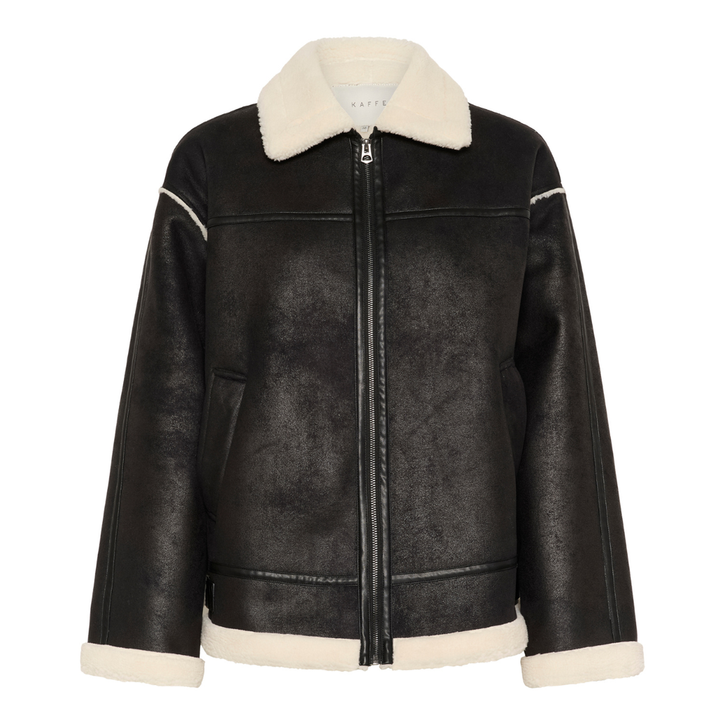 Mega cool ruskinds look a like jakke fra Kaffe. Man får simpelthen sådan lidt "old school wibes" i den her jakke. Den har et lyst og lækkert bamsefór indvendigt samt på kraven, ærmerne og nede i linningen. Derudover har den skrå lommer, lynlås, justerbart bæltespænde i hver side hvis man ønsker et mere tætsiddende look ved hoften samt fine læder look a like pyntebånd flere steder på jakken. Den er kort sagt MEGA cool.