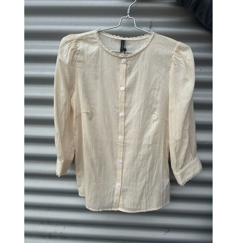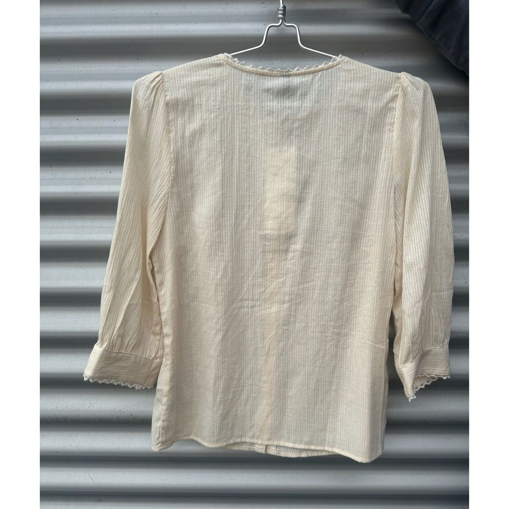 Fin lille skjorte bluser i stribet vævet stof i meget meget lysegul - lille blonde kant i hals og på ærmer - ærmerne er 3/4
