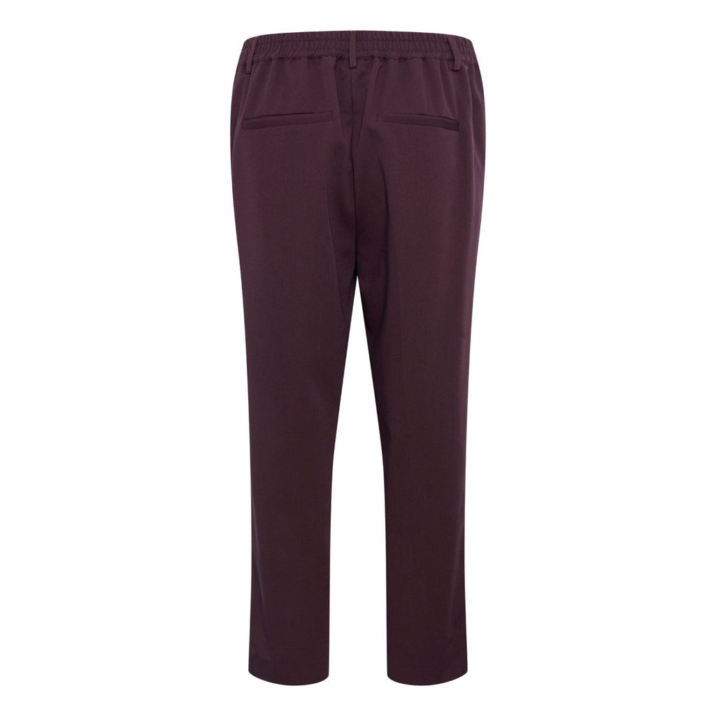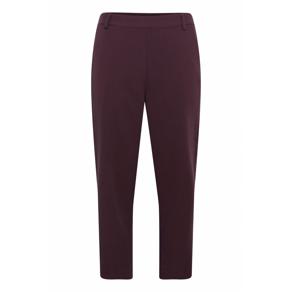 Fine højtaljede bukser fra Kaffe. Sakura HW cropped pant har elastik og et fast stykke i livet, skrålommer og paspel lommer bagpå. De har lige ben med vidde og pressefolder. Farven er bordeaux