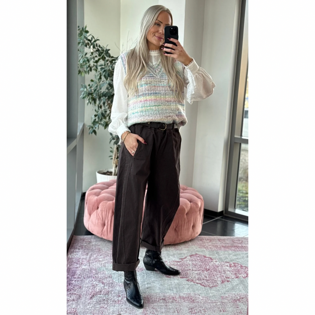 Lækre bukser fra By Asbæk i den flotte chokoladebrune farve. Tenna pants har elastik i taljen og har et loose fit. Til de høje piger, er det ikke en fuld benlængde, og de har indsnit så de går en smule ind forneden. Bukserne har lommer i siderne, og ingen lommer bagpå. Der medfølger et bælte som primært er til pynt, og nemt kan udskiftes. Det lille opsmøg forneden giver en fin detalje, men kan også sagtens rulles ned.