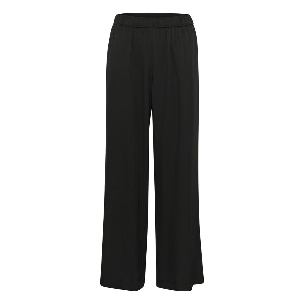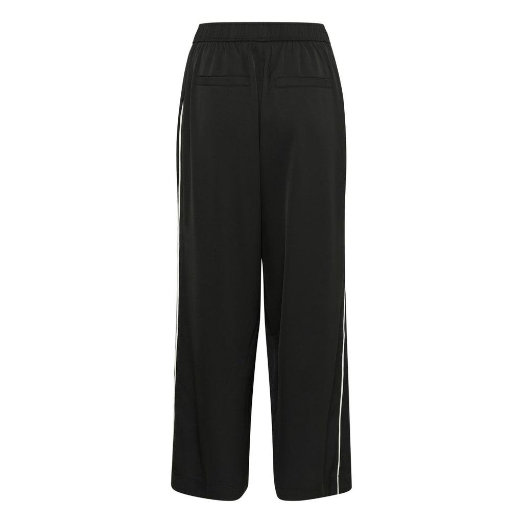 Flotte klassiske bukser fra Kaffe. med et tvist - materialet er helt let og lækkert - den har en råhvid stribe ned langs benene - lommer i siden og elastik i taljen- Taljen er høj, men kan trækkes ned for et mere sporty udtryk