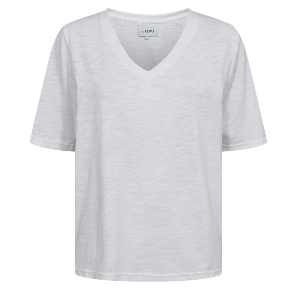 Lækker blød basis t-shirt fra Liberté . T-shirten har en helt perfekt løs pasform, v-hals og kort t-shirt ærme der dækker det øverste af skulderen.