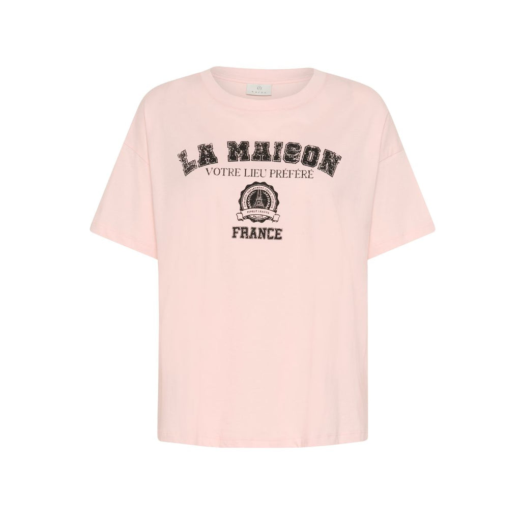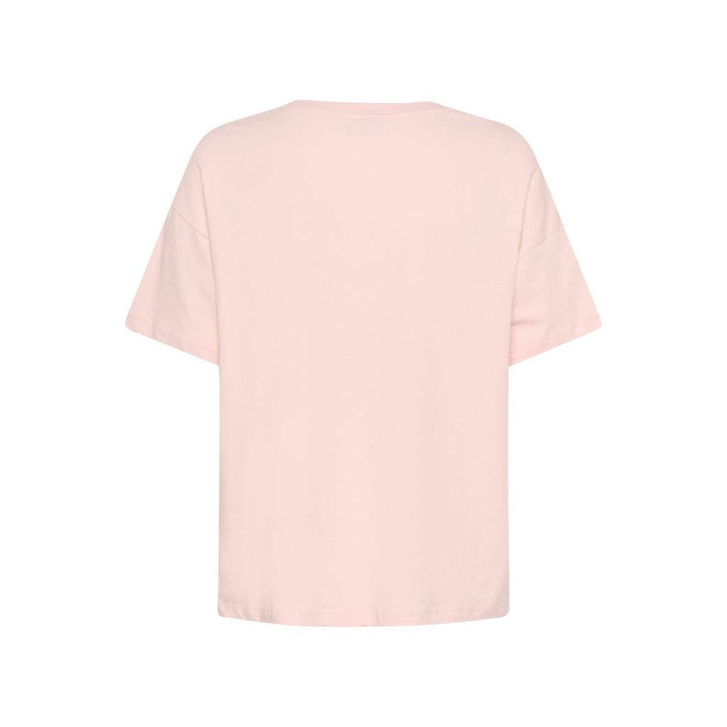 Klassisk T-shirt fra Kaffe i en lækker lyserød farve med fudge  print. T-shirten har box fit pasform, rund hals og er rummelig i størrelsen. Ærmelængden er lidt længere end normal t-shirt længde, de når ca. ned til albuerne.