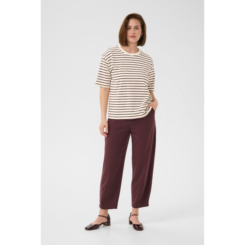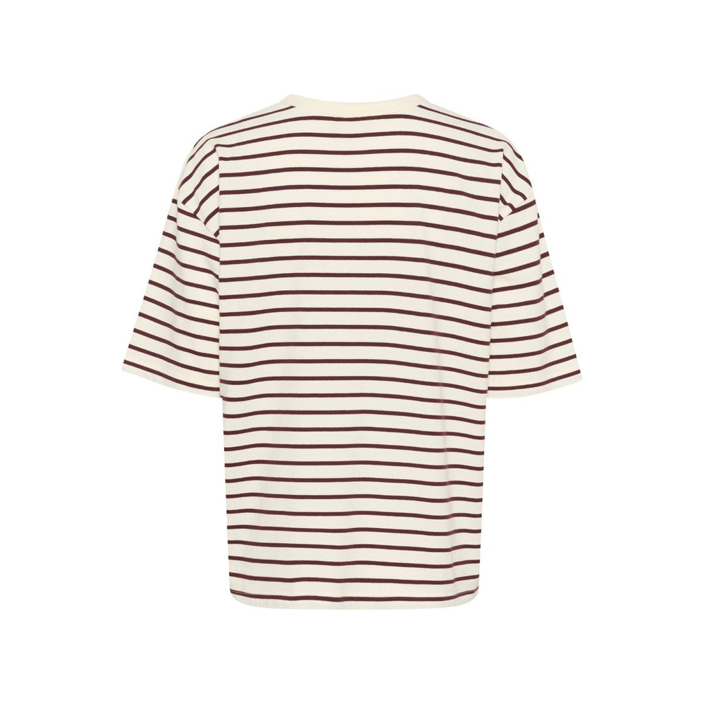 Blød, stribet bomulds bluse fra Kaffe. Blusen har korte ærmer, den er rummelig i størrelsen. Den har har rib kant i halsen. Den er i brunlig med strejf af lilla, kaldet fudge og hvide striber.